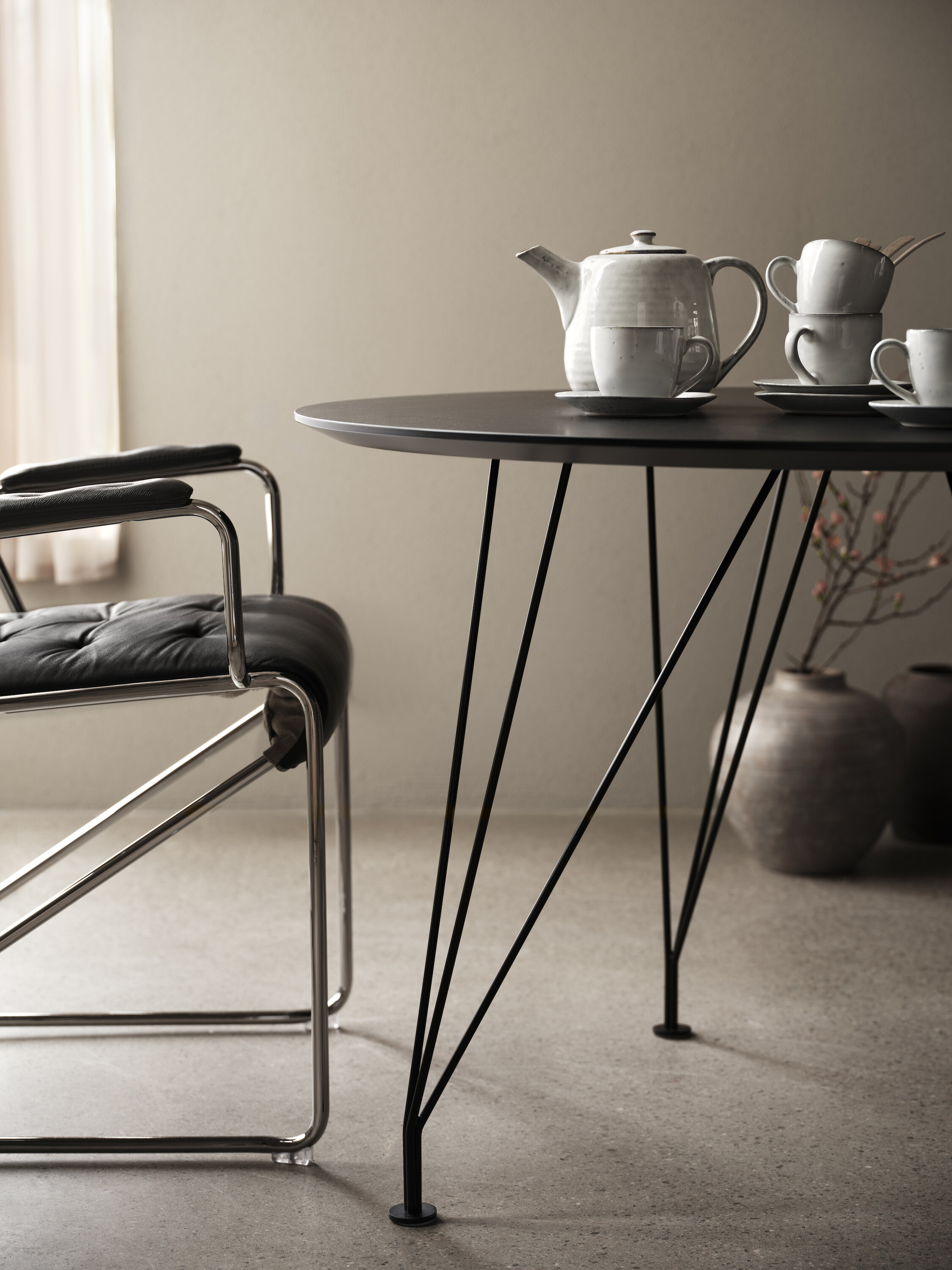 A classic round table in chrome with a glass top.