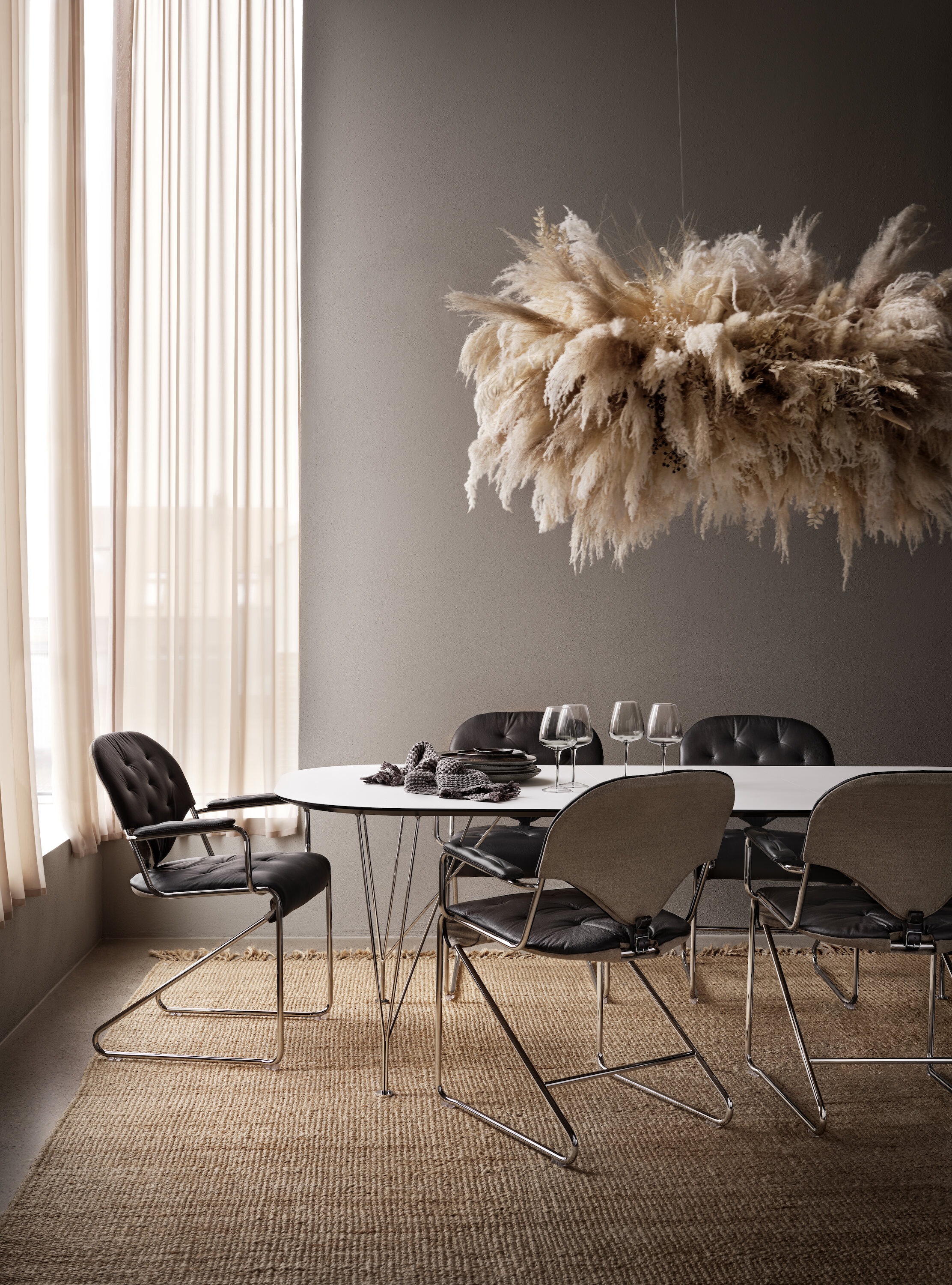 Oval dining table that encourages conversation and eye contact with all guests. Also available in two more versions, a dining table with two extendable tops and a smaller café table size.